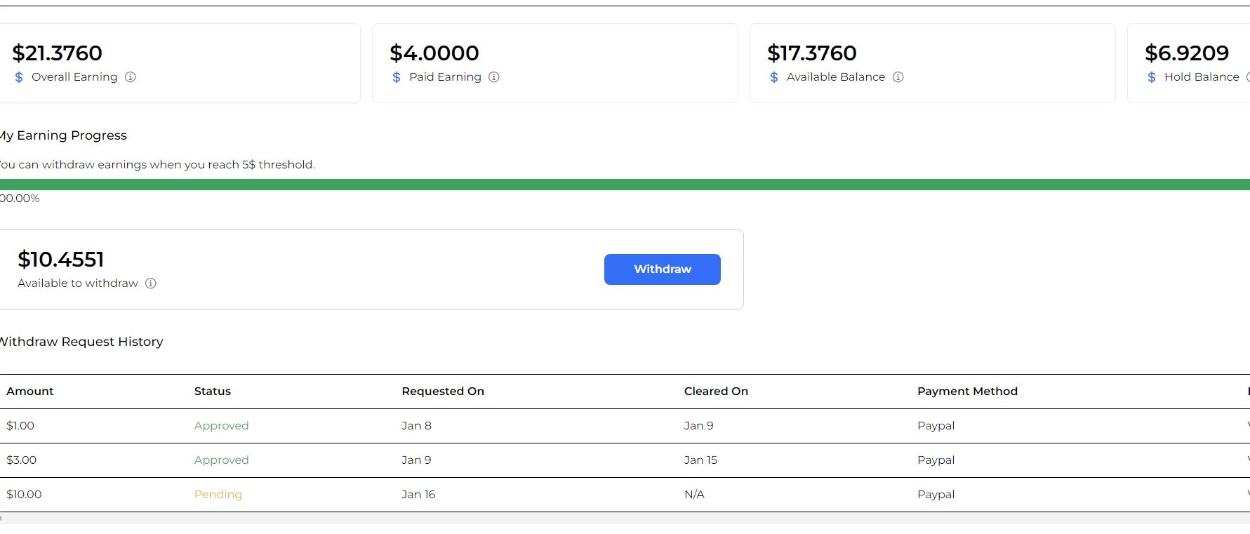 DL托管文件美金项目,在此平台分享你自己的txt或者ppt文档等等文件,然后分享给好友,就会获得对应的奖励,原理是列如你上传分享你的ppt文档,然后把链接分享到油管和脸书等待国外社交平台,别人访问下载,你就会获取对应的奖励。目前测试已经到账!测试数据单击,5开的话一天是1.5美金左右,当然我测试的时候我的动态住宅ip连接很慢,导致我的收益很低的,比如5开就相当于就开了2开。如果住宅动态ip连接快的话。收益很快,1000次下载CPM2.5美金。所以决定你的收益高的话,第一动态ip要快,第二你要多开。列如你50开,动态住宅速度也快的话。单日单机50-80美金左右!